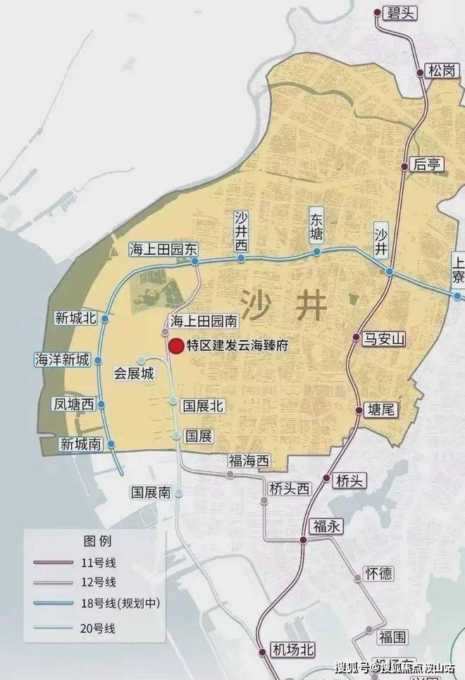 特建发云海臻府项目位宝安区沙井街道和一社区会展海洋城片区,南环路与展景路交汇处西南侧,距离12号线海上田园南站步行约250米,距离20号线会展城站步行1公里。