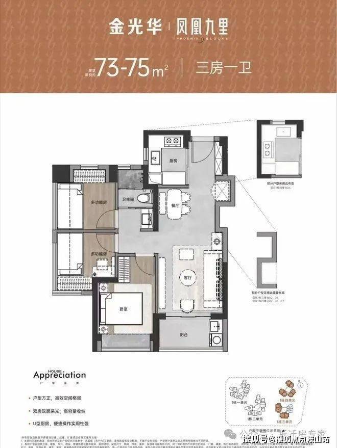 73㎡的3房2厅1卫,设计的是竖厅格局,S墙设计预留冰箱位,双次卧双面采光,U型厨房,卫生间三段式分离设计,有西南朝向及东南朝向。