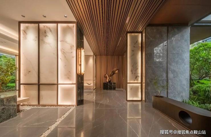 归家的第一重礼序,从70米超宽界面的酒店式落客门庭开始。大面积素净弧形背景墙配合金属铝板天花,成为了恢弘大气的门庭基调。同时,迎宾水景搭配珍贵的罗汉松等植物组团,叠山造景,在一动一静中巧妙地把社区外部的繁华闹市和内部的静谧园林区隔开来,使建筑和景观相辅相成,营造出深邃又流畅的灵动之美。