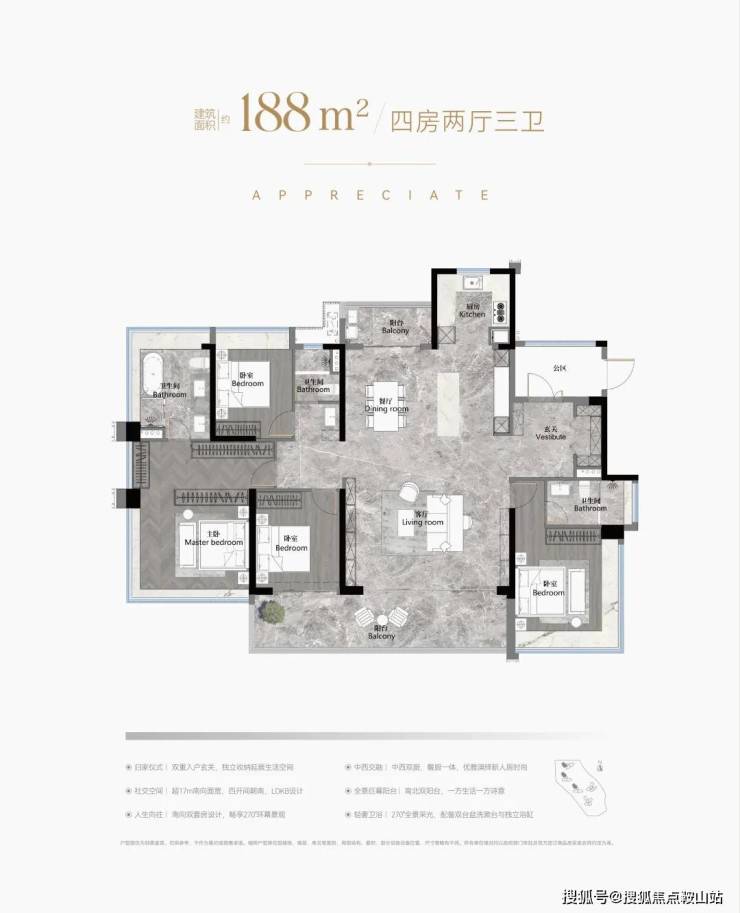 建面188平四房三卫,据说使用率超110%,双主套分居两侧,三代同堂的话,可以很好地避免两代人不同的休息时间干扰互相,入户独立玄关为还有宽裕的储蓄空间,能安置酒柜等,更有南北对流双阳台+中西双厨,主卧超宽三面采光等,不愧是终极改善不二之选,9米长跑道阳台,约34平豪华主卧,270度环幕飘窗