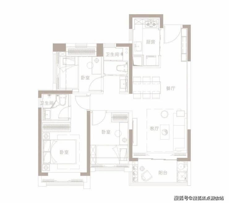 在项目推出的4个户型中,最小户型建面约83㎡的3房2厅1卫,户户朝南,明厨明卫干湿分离,空间分布紧凑合理,可以满足普通刚需家庭的居住需求。