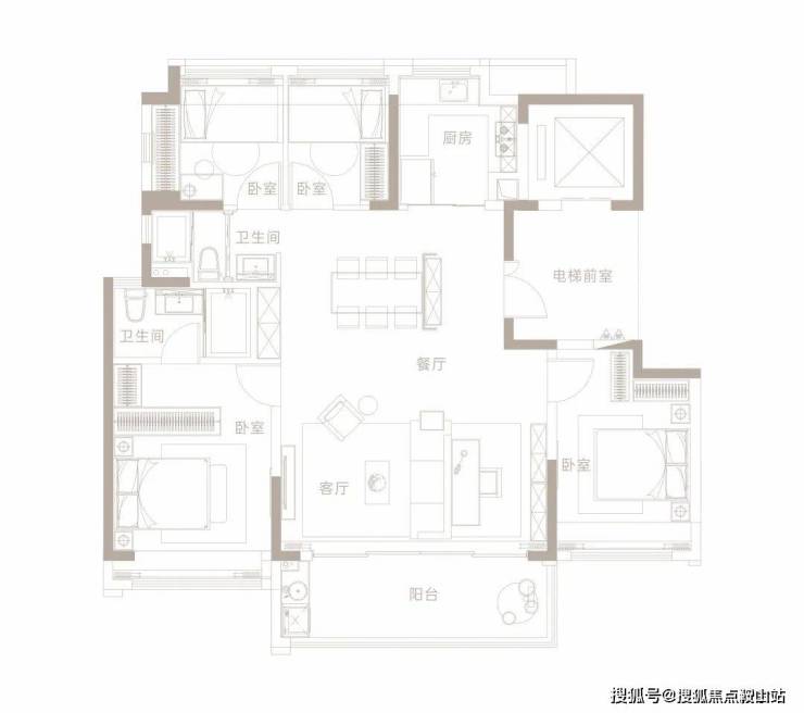 竖厅户型南向通透的3卧室都带有飘窗,具有很好的实用性。