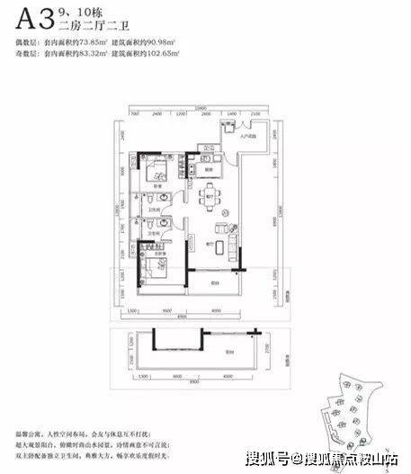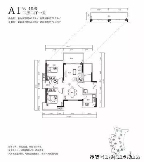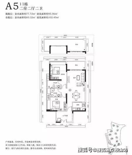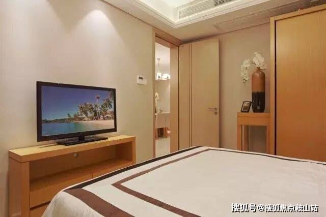 户型南北朝向,双卧室都带大落地玻璃窗,通风、采光、观景三重享受。厨房和卫生间都带窗户,明厨明卫,采光强,通气佳,居家度假不压抑。