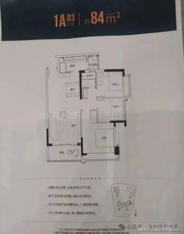 84㎡的3房2厅1卫(1栋A座03户型),设计的是竖厅格局,客厅3.6米开间,动静分区,一字型型厨房,还带1个小生活阳台,卫生间三段式分离设计,得房率:79.62%(不含赠送),阳台东南朝向。