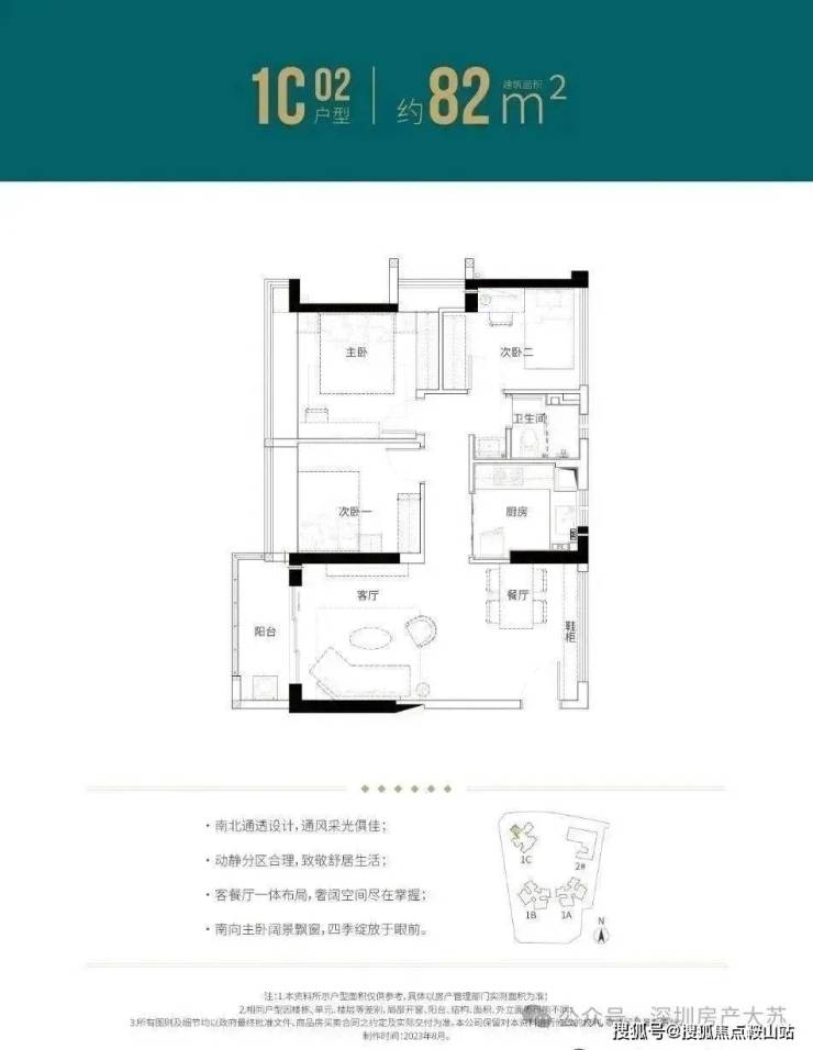 82㎡的3房2厅1卫(1栋C座01户型),设计的是竖厅南北通透格局,客厅3.6米开间,三开间朝南,动静分区,L型厨房,得房率:77.27%(不含赠送),阳台西南朝向。