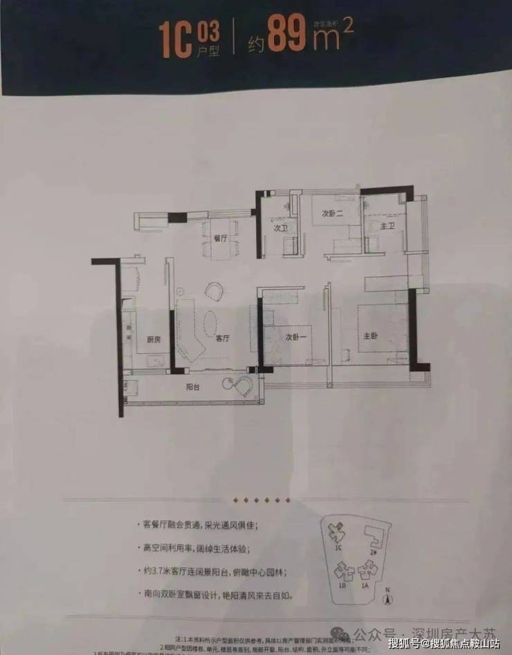 89㎡的3房2厅2卫(1栋C座03户型),设计的是竖厅南北通透格局,客厅3.6米开间,动静分区,主卧大套间设计,超大L型厨房,得房率:77.27%(不含赠送),阳台主朝东南向。