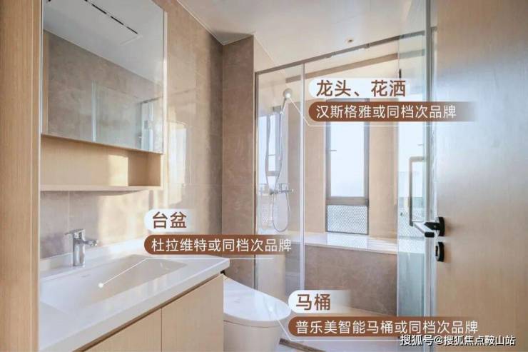 其中,全屋卫浴赠送全屋智能马桶,配备汉斯格雅、杜拉维特(或同款品牌)等五金洁具;