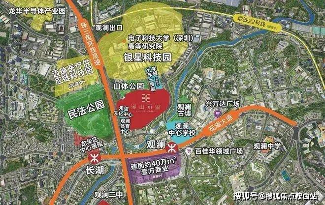 项目规模较大,整体东南向沿观澜河布局,与观澜古墟历史文化街区一河之隔;西南向毗邻梅观大道及深圳民法公园;北向背靠山体公园,与银星科技园、迈瑞医疗龙华基地(建设中)等重磅产业园相近。