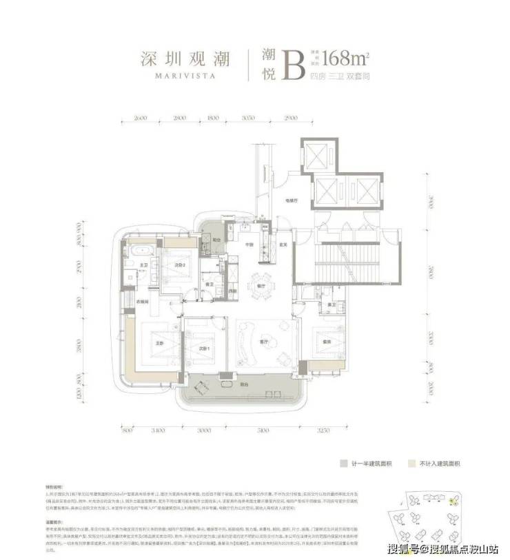 🌊 168㎡ 四房三卫双套间「舒居优选」• 超尺度采光电梯厅+户内独立玄关,静谧归家,礼序天成;• 约50㎡社交客餐厅,可变横厅+中西互动双厨,南北通透双阳台;• 约15米南向宽境+8.1米观景阳台,环幕阔景,舒展生活;• 双套房+三卧室朝南,主卧270°转角飘窗,藏纳湾心温柔。