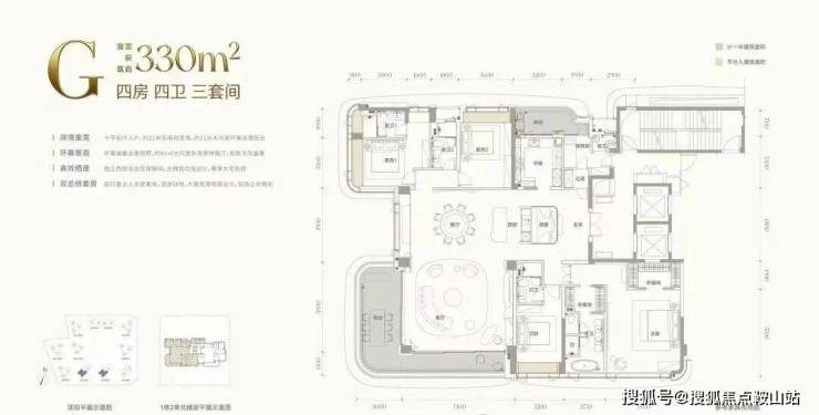 🌊 330㎡ 四房四卫三套间「顶豪臻藏」• 约21米东南向宽境+21米环幕全景阳台,360°环幕视野揽尽湾海盛景;• 十字前厅入户,约78㎡多场景转角厅,成为大家庭聚会的社交殿堂;• 独立西厨岛台、酒柜及保姆间设计,主佣双动线,尊享大宅私密;• 约53㎡超尺度主人总统套房,洄游动线+双独立衣帽间,三套房设计,匹配塔尖圈层生活。
