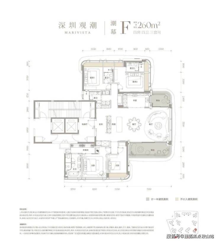 🌊 260㎡ 四房四卫三套间「全景海景」• 2梯2户+约3.3米奢适层高,约17米南向宽境+21米环幕全景舱,户户观海;• 专梯入户+十字前厅+仪式玄关,层层递进,彰显归家尊崇;• 约57㎡社交方厅+独立西厨岛台,270°环幕全景阳台,南北通透,盛载社交与生活;• 约36㎡主人总统套房,独立衣帽间+落地窗,三套房设计,大宅尊享。