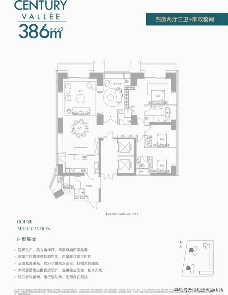 386㎡的4+1房2厅4卫:仅3栋A/B座C户型,双梯入户,设计的是竖厅格局,客厅5.8米开间,LDKB一体化设计,双阳台,主卧大套间约31㎡,次卧套间约15.5㎡(不含卫生间),次卧约17.81㎡/12.96㎡/7.36㎡,
