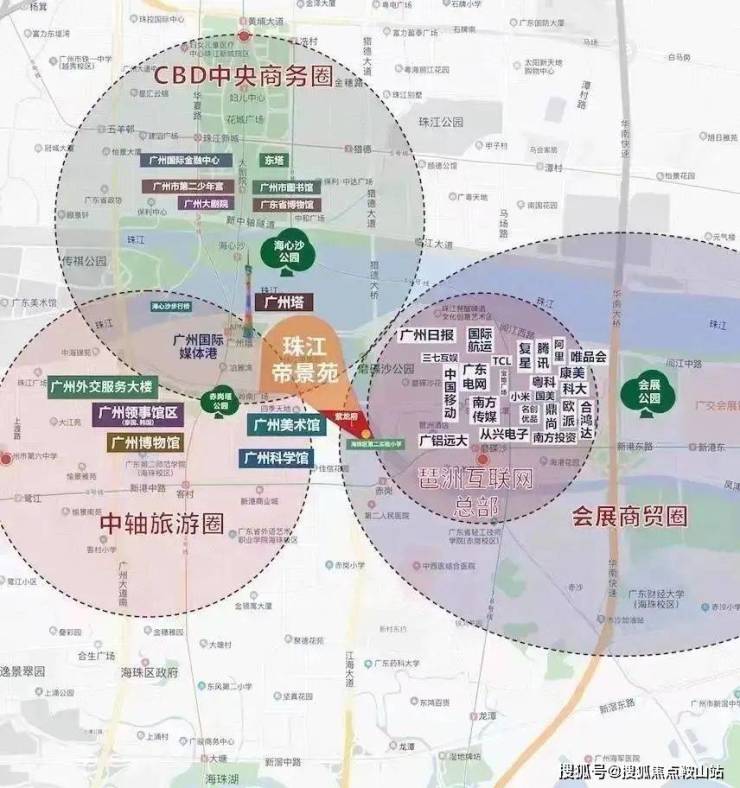 广州塔板块已成为最核心最被看好的区域,以广州塔为核心的新城市中轴线方圆一公里范围内,都是广州中心城区市政规划的重点区域,周边环绕三馆一场(美术馆、博物馆、科学馆、岭南广场、海心桥)、琶洲千亿级互联网CBD区(腾讯、阿里、复星、国美、小米等入驻)、珠江啤酒博物馆、广州报业文化广场、领事馆区、湿地公园等,形成独有的高端人文圈层。该板块资源稀缺,买少见少,地价一路飙升。