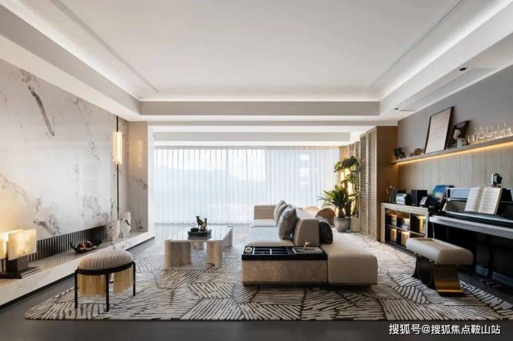 入户单元门头整体和小区入口大堂呼应,顶部强调轻薄精致的挑檐,两侧采用大象灰石材哑光面和拉槽面,搭配定制蟒水纹金属网,尊贵而不失精致,大面积采用的浅灰色材料跟出挑舒展的雨棚,营造出轻松写意的度假感。