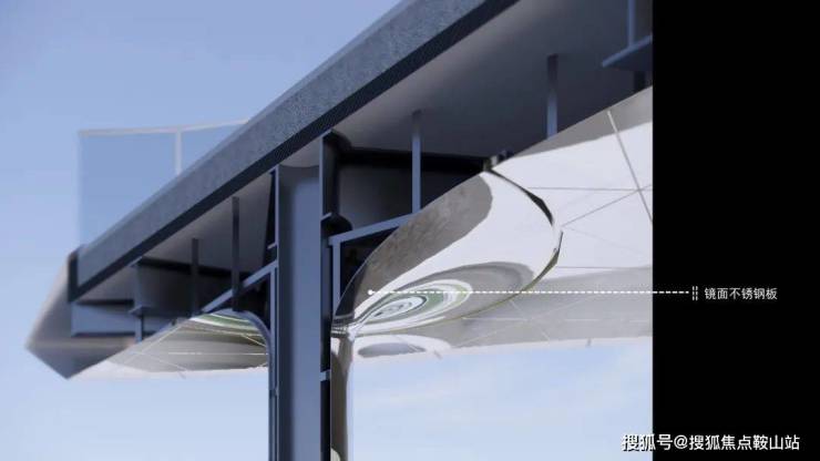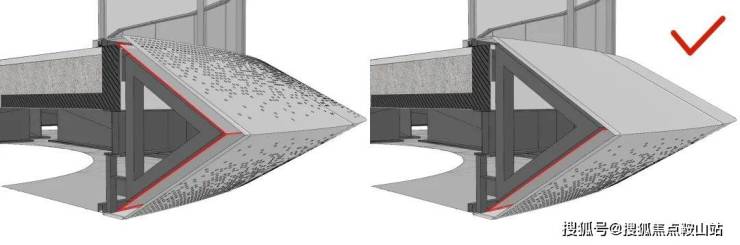 考虑到防水的问题,我们采用斜向下的穿孔板,背衬板也只在下部安装,即保证了人视点的效果,又节省了成本。