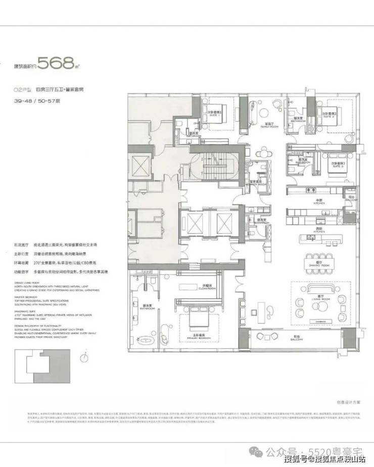公寓主力户型为304㎡、327㎡、402㎡、570㎡以及1032㎡,公寓层高3.6米,低区5T3,高区5T2。