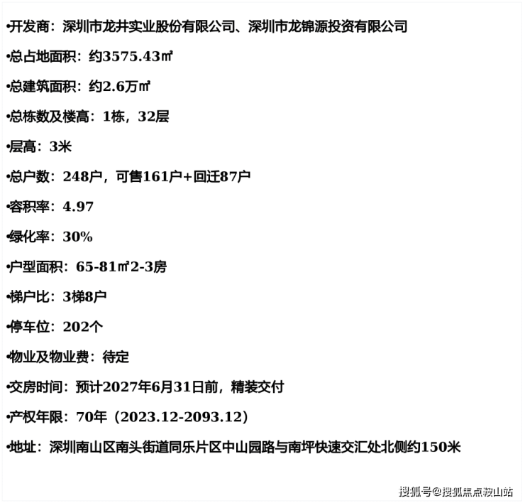 卓越珑秀公馆踞南山同乐片区,紧邻在建地铁 12 号线同乐南站(步行约 500 米),毗邻科技园、前海自贸区及留仙洞总部基地,5 站可达高新园,项目已出地面 6-7 层。项目总占地 3575㎡,总建面约 2.6 万㎡,容积率 5.11,绿化率 30%,由 1 栋 32 层住宅构成,规划 248 户(含 161 套商品房),配 199 个车位。