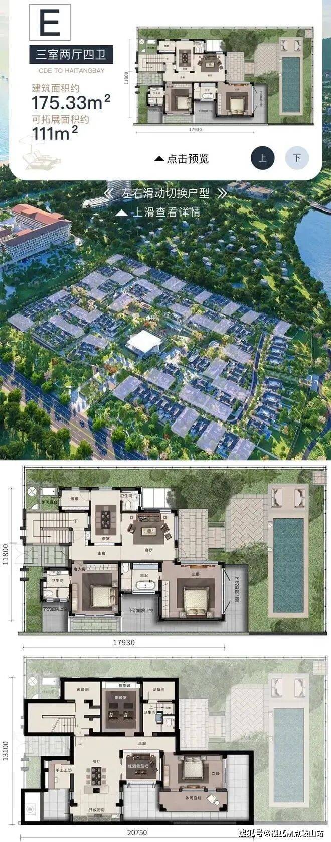 E户型:三室两厅四卫,建面约:175.33㎡ ,可拓展面积约:111㎡,占地面积约332-1020㎡