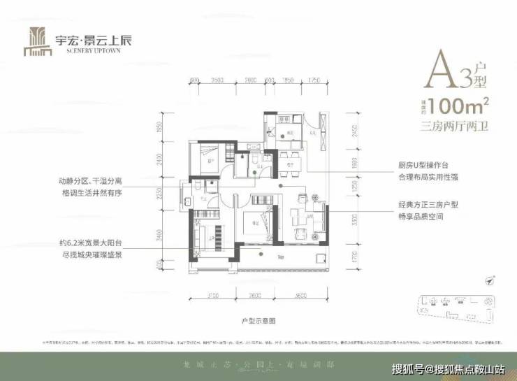 100㎡的3房2厅2卫,设计的是竖厅格局,客厅3.6米开间,LDKB一体化,三开间朝南,3个卧室分别做到了3.1米/2.6米/2.4米的宽度,客厅连接次卧出6.2米长的大阳台,U型厨房,卫生间干湿分离,得房率约76%(不含赠送),东南朝向。