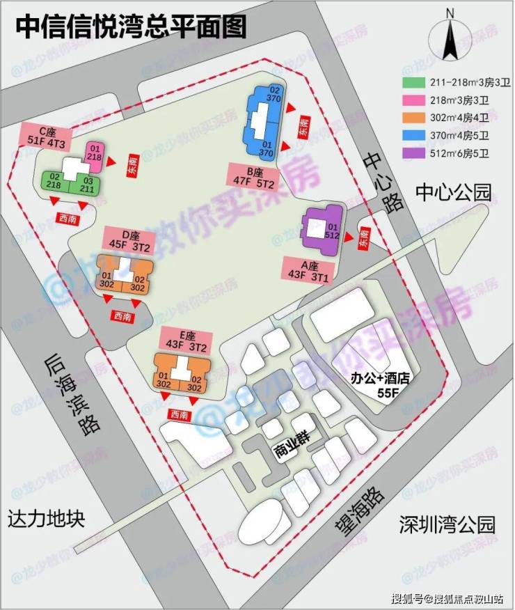 中信信悦湾共分两期,一期为住宅,二期为办公+酒店+商业。一期共有五栋43-51层超高层住宅,共403套211-217-302-370-512㎡大平层。户户朝南,可看海景。