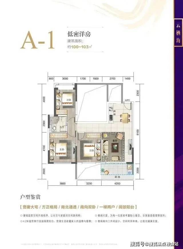 一梯两户,南北通透,阳光清风入户无拘束;双卧室朝南设计,4.2米面宽客厅连接阔景阳台,三面阳光环绕,生活乐趣自由延伸。
