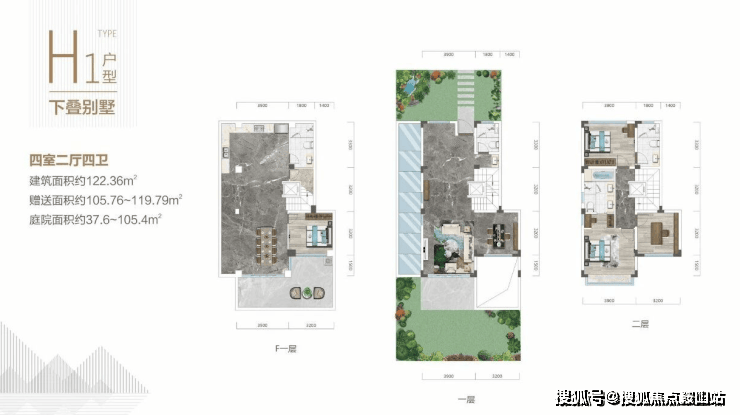 下叠122㎡,4房2厅4卫,共计3层,花园37-56㎡,赠送面积119㎡,实用面积265-291㎡,另赠送地下停车位,私家电梯层层通达。