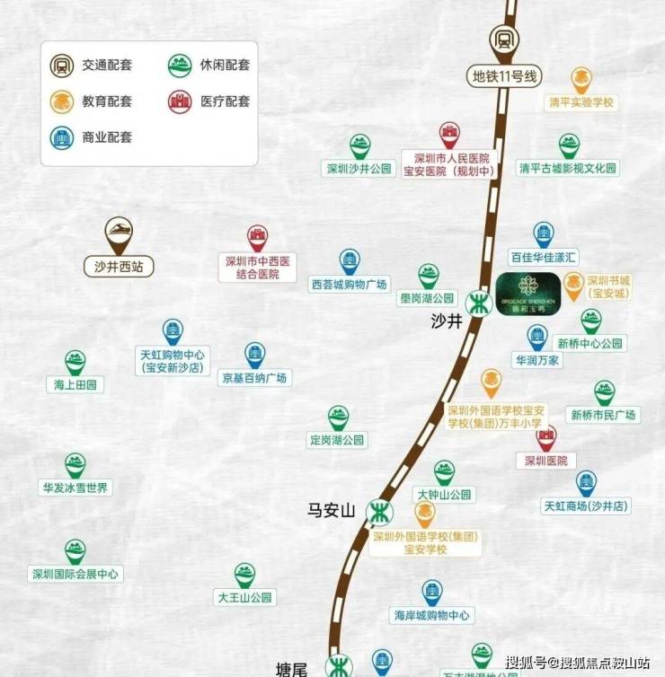 :距11 号线沙井站 C/D 口仅 400-550 米,步行 7 分钟可达,11 号线为深圳西部快线,6 站到宝安机场、8 站到宝中、9 站到前海、15 站到南山高新园,30 分钟覆盖福田 CBD,通勤核心区高效便捷。