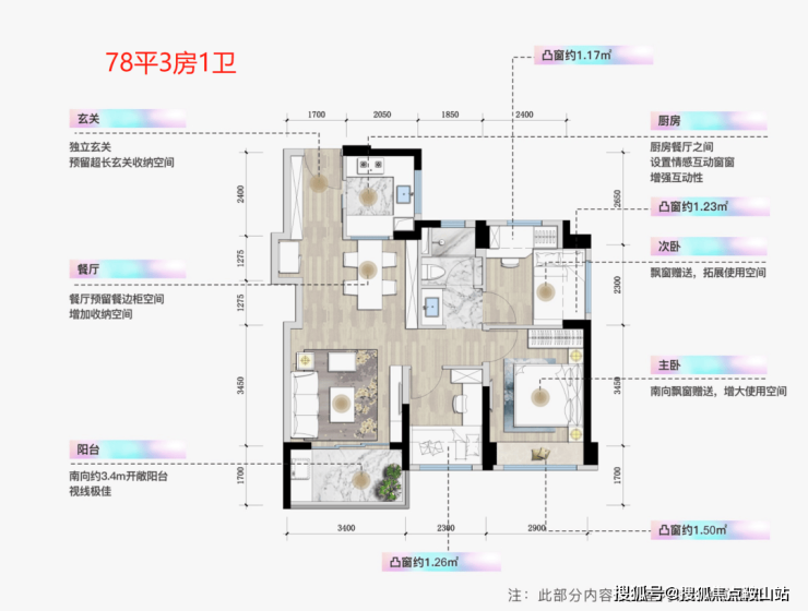 户型主要有三个:78平3房1卫,95平3房2卫,112平4房两卫三个户型