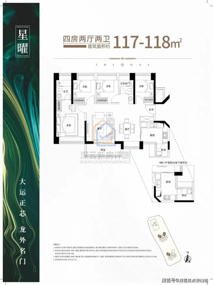 118㎡南北通透四房户型,单价5.04-6.10万,595-718万;