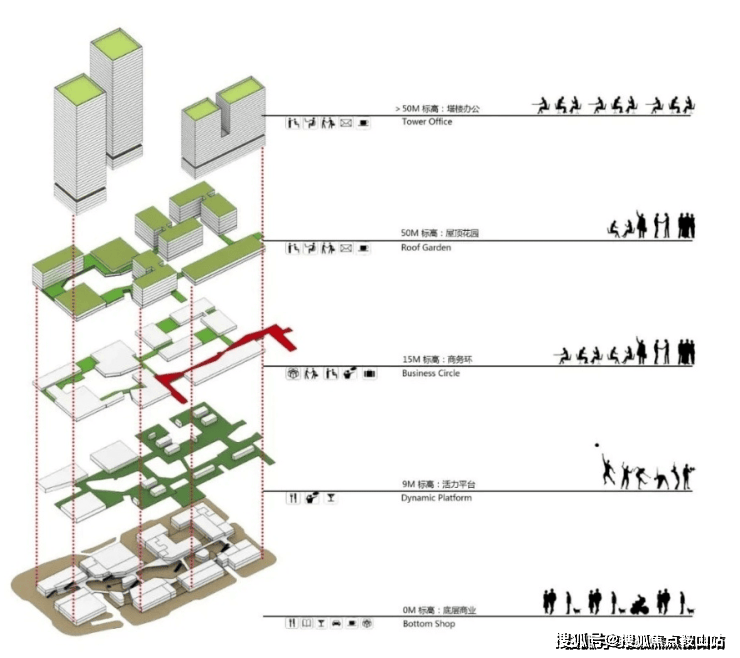 项目根据企业的发展阶段及需求,将园区分层处理。底层打造活力商业街区;向上依次为中小型企业,大中型企业,大型企业及伟大企业。整个标段从下到上,公共度递减,私密度递增,使用人群各取所需,最大化提升产品附加值。