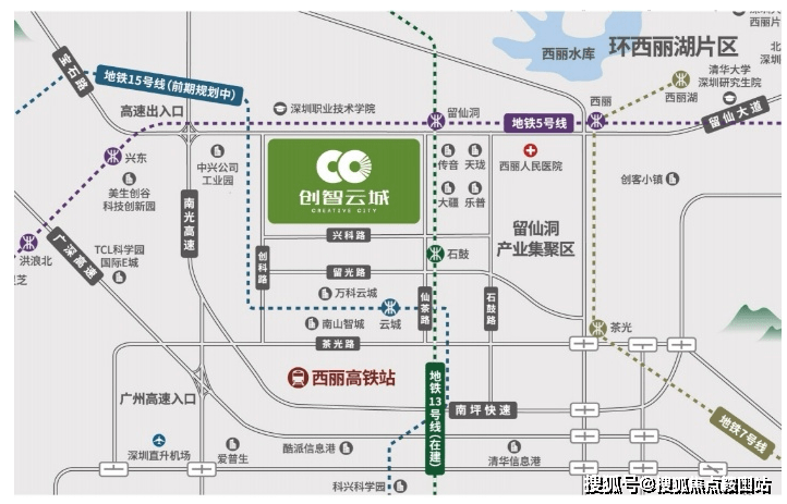 创智云城位于深圳市南山区留仙洞总部基地西北角,北临深圳职业技术学院西校区,西靠中兴通讯工业园与健康主题公园,东侧和南侧为深圳市大疆创新科技有限公司总部和深圳绿廊公园。