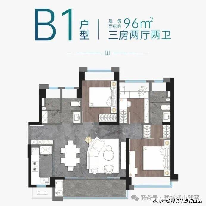 :该户型得房率约 81%,空间利用率高。主卧面积达 12.5㎡,配有独立卫浴和步入式衣帽间,两个次卧分别约 8.5㎡和 7.2㎡,且均带飘窗,能满足家庭成员的居住舒适度。同时全屋科学布局 8 大收纳空间,卫生间采用三分离设计,马桶区、洗漱台、淋浴间完全隔开,可满足多成员同时使用,适配有孩子的三口之家。