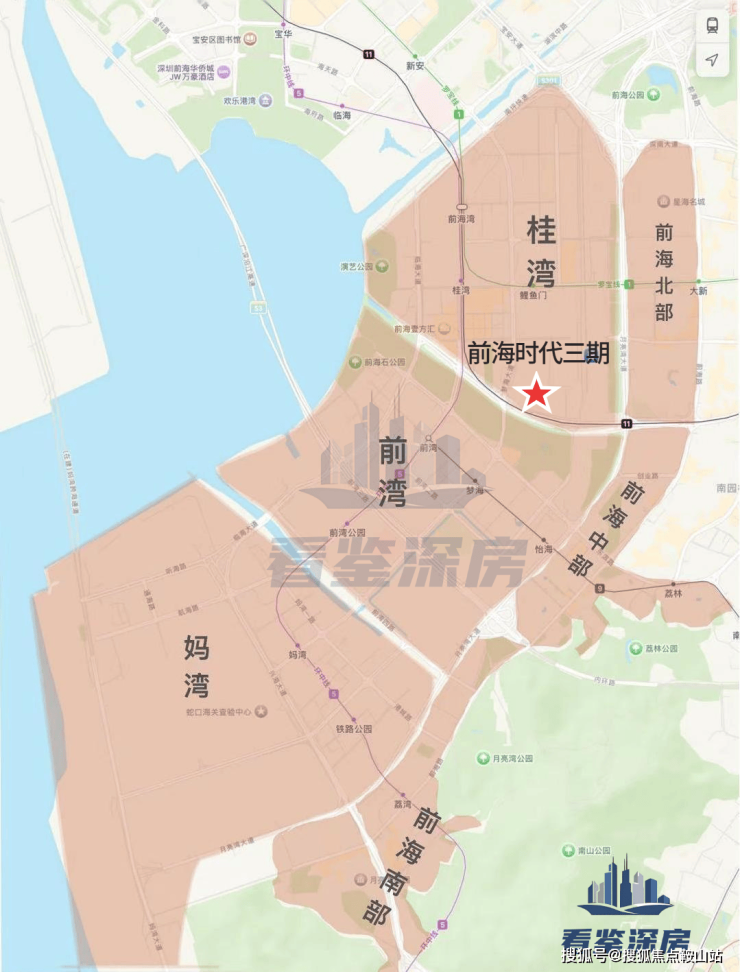 「前海时代三期尊府」位于前海桂湾片区南侧,临近滨海大道和桂湾河,在整个前海自贸区内算是住宅的C位,正南侧水廊道公园,东南望南山西南看城市海景。