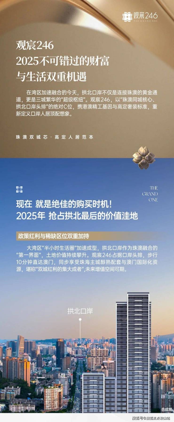观宸246,位居拱北口岸头排,珠澳同城核心板块,城市中心+口岸物业双极加持,近10年来距离拱北口岸、港珠澳大桥口岸最近的纯住新盘,左手澳门世界级休闲娱乐配套,右手拱北城市烟火生活,坐享醇熟配套,畅享港珠澳三城无界生活。