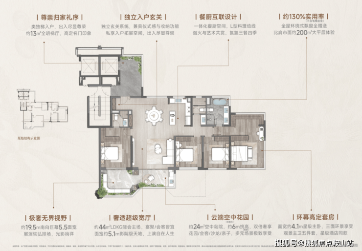约33平方米“LDKG”横厅(将客厅、餐厅、厨房和阳台这四个公共区域融合在一起的住宅户型设计)面宽达17.6米,搭配6米挑高空中浮岛花园。