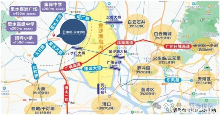 【临广核芯|金沙洲最值得购买的地段】直线距离约3km至白云,1有轨电车(建设中)2地铁(规划中),建成后1站白云,4站荔湾,7站越秀,直通天河;门前里水大道,一桥连接白云、荔湾,速达广州多区。