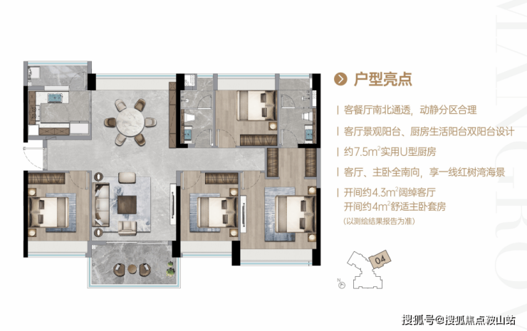 舒居格局,采光、通风卓越,客餐厅南北通透,4房满足多代人的生活想象;客厅、主卧可独揽头排海景景观。