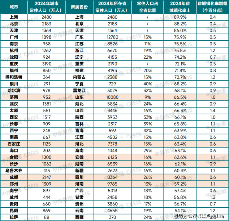 从主要省份来看,广东、江苏、浙江、辽宁、福建城镇化率较高,2024年城镇化率均在70%以上。山东、河北、安徽、湖南、四川、河南等省份常住人口规模较大,但城镇化率仍低于全国平均水平,其中河南省拥有近1亿常住人口,城镇化率仅59%;四川省超8000万人口,城镇化率仅60%;另外,西南的广西、贵州、云南等省份城镇化率均低于58%,未来这些省份城镇化仍有较大提升空间,在此过程中,区域中心城市有望成为人口主要流向地。