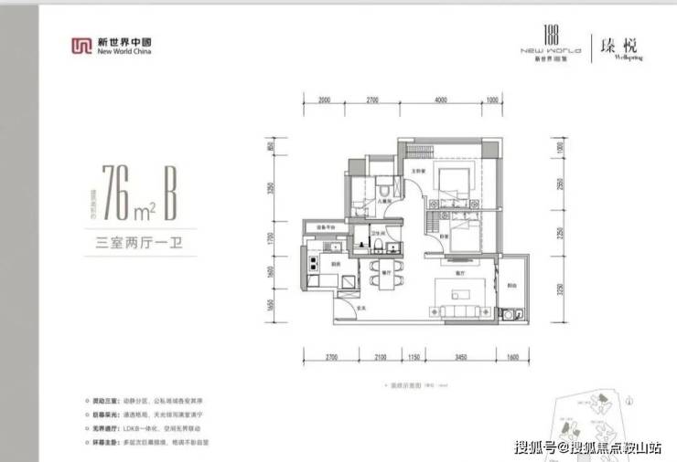 76㎡的3房2厅1卫,设计的是竖厅格局,客厅3.3米开间,LDKB一体化设计,动静分区,分别做到了主卧12.3㎡/次卧11.02㎡/次卧8.28㎡(包含墙体飘窗),U型厨房,卫生间干湿分离,同时带1个设备阳台约1.5㎡,阳台约5.28㎡东北、西北或东南朝向。