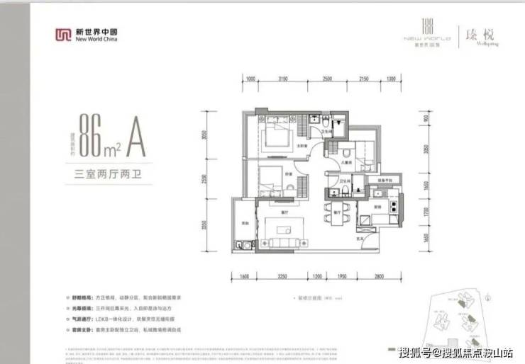 86㎡的3房2厅2卫,设计的是竖厅格局,客厅3.35米开间,LDKB一体化设计,动静分区,分别做到了主卧13.75㎡/次卧10.84㎡/次卧9.43㎡(包含墙体飘窗),U型厨房,卫生间干湿分离,同时带1个设备阳台约1.3㎡,阳台约5.36㎡东北或东南朝向。