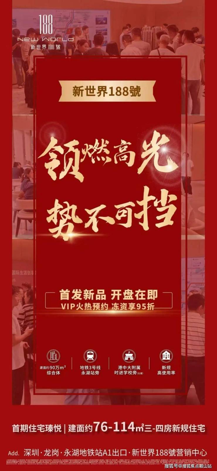 龙岗永湖,新世界188号臻悦(备案名:新璟曜广场),已取证,4月23日9点开启冻资5万,截止28号。预计29或者30日左右开盘选房。不排除抽签摇号选房。备案均价3.86万/㎡,开盘直接打85折优惠,3房折后总价237万,4房折后总价313万起!