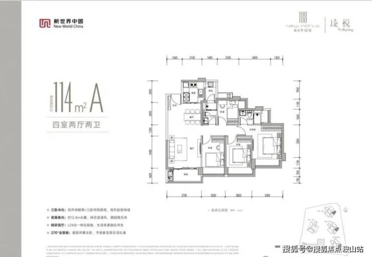 114㎡的4房2厅2卫,设计的是竖厅格局,客厅3.7米开间,LDKB一体化设计,动静分区,四开间朝南,分别做到了主卧17.34㎡/次卧12.68㎡/次卧11.35㎡/次卧7.42㎡(包含墙体飘窗),U型厨房,卫生间干湿分离,同时带1个阳台约3.79㎡+设备平台约1.2㎡,阳台约5.92㎡东南朝向。
