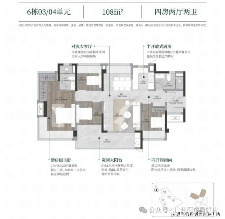 106㎡四房:6.5米阳台,主卧270°观景,独立衣帽间。