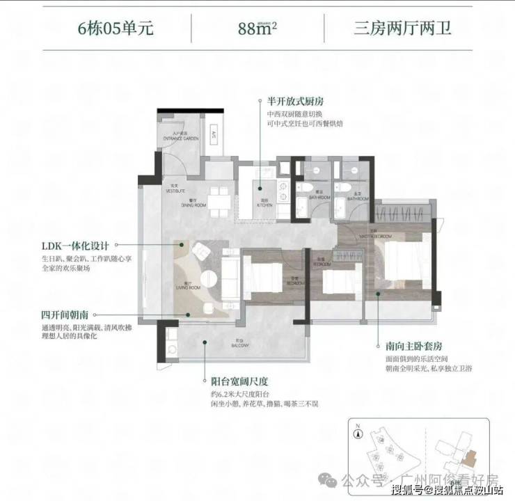88㎡三房:6.2米阳台,四开间朝南,总价339万起。