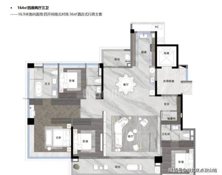 建面164平四房三卫,约16.9米南向采光面,四开间朝南,算是个飞机户型,36平的大主卧。