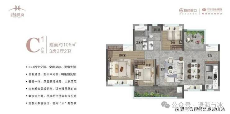 105㎡3+1房:南北双阳台设计,南向6米景观阳台,主卧套房带独立衣帽间,改善升级首选。