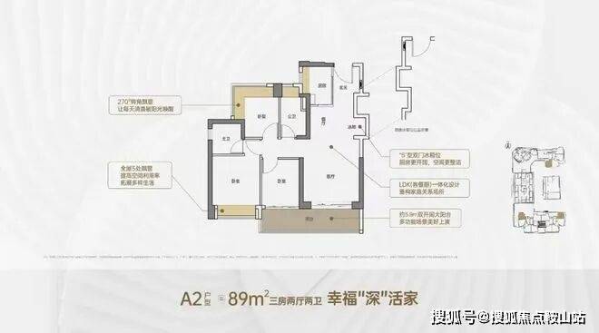 89㎡的3房2厅2卫,A2户型,设计的是竖厅格局,客厅3.5米开间,LDKB一体化,S墙设计预留冰箱卡槽位,客厅连接次卧出5.9米长的大阳台,次卧270度转角飘窗,U型厨房,卫生间干湿分离,阳台有朝西向、东向、南向。