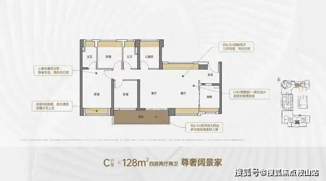 128㎡的4房2厅2卫,设计的是横厅南北通透格局,客餐厅6.5米开间,进门户玄关,LDKB一体化,客厅连接次卧出6.1米长的大阳台,主卧大套间设计,全屋8处飘窗,U型厨房,卫生间干湿分离,阳台主朝南向。