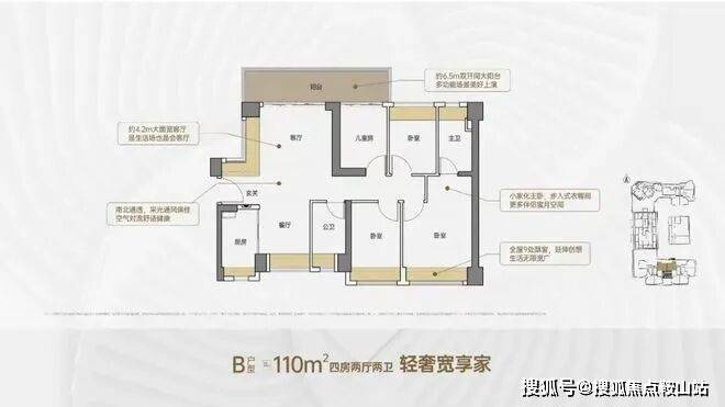 110㎡的4房2厅2卫,设计的是竖厅南北通透格局,客厅4.2米开间,进门户玄关,客厅连接次卧出6.5米长的大阳台,主卧大套间设计,全屋9处飘窗,U型厨房,卫生间干湿分离,阳台主朝北向。