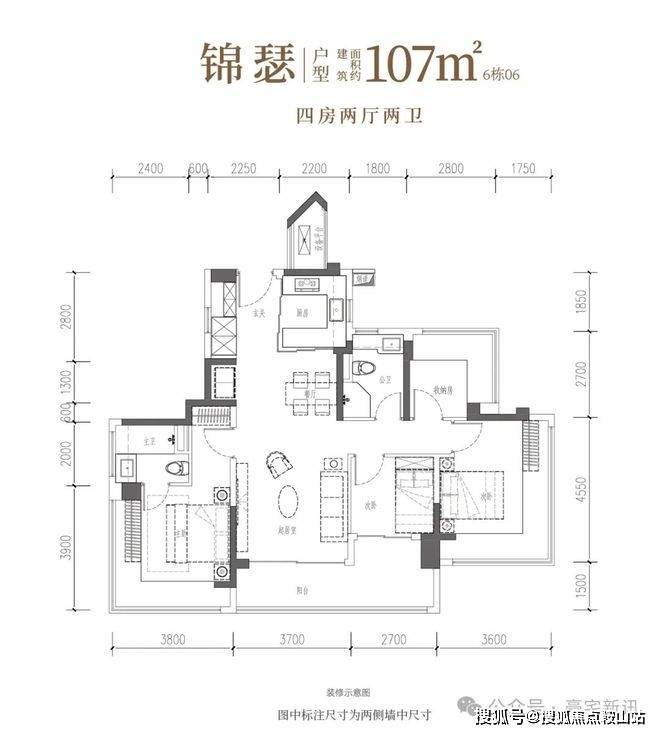 •锦和·约106㎡四房两厅两卫:南向四开间,一线园林景观,自在奢想建面约106㎡宽幕人生,以IMAX光幕揽景,以LDKB方厅聚情,更以转角视野与匠心细节,奢享从容生活。